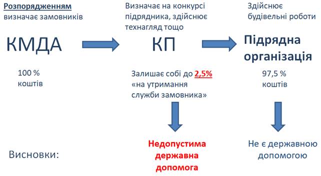 26 вересня 2019 року Антимонопольний комітет зобов’язав КМДА повернути незаконну державну допомогу, визнану недопустимою для конкуренції (2,5% «на утримання служби замовника»). Водночас кошти, за які підрядні організації здійснюють роботи, не є державною допомогою, тобто, жодних загроз будівництву та реконструкції немає.
