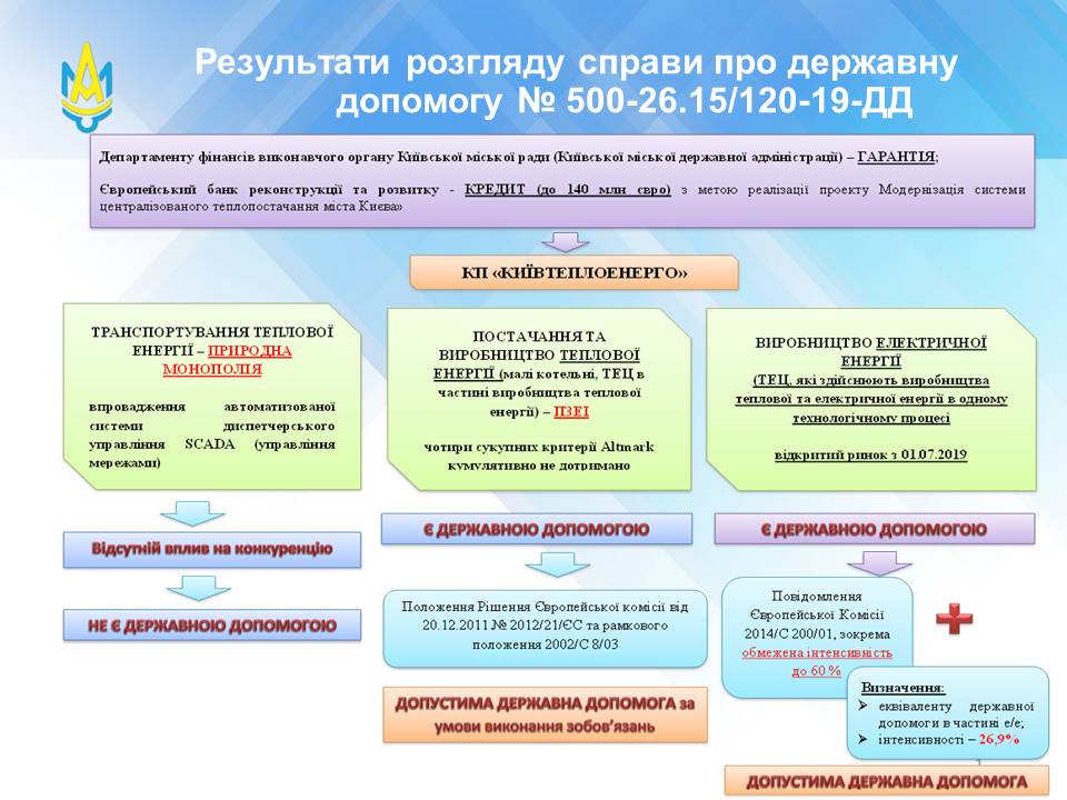 Антимонопольний комітет встановив, що підтримка КП «Київтеплоенерго», який є природнім монополістом із транспортування теплової енергії, в частині запровадження автоматизованої системи диспетчерського управління SCADA, не є державною допомогою. Допомога в частині виробництва електричної енергії відповідає умовам, за якими допомога у сфері енергетики і навколишнього середовища вважається сумісною з внутрішнім ринком, тож вона є допустимою державною допомогою. А підтримка, яка стосується виробництва теплової енергії, є допустимою за умови виконання київською владою низки зобов’язань. Серед них: розробка методики розрахунку компенсації, її контролю та перегляду, а також механізму для уникнення надмірної компенсації та повернення надлишкових коштів.