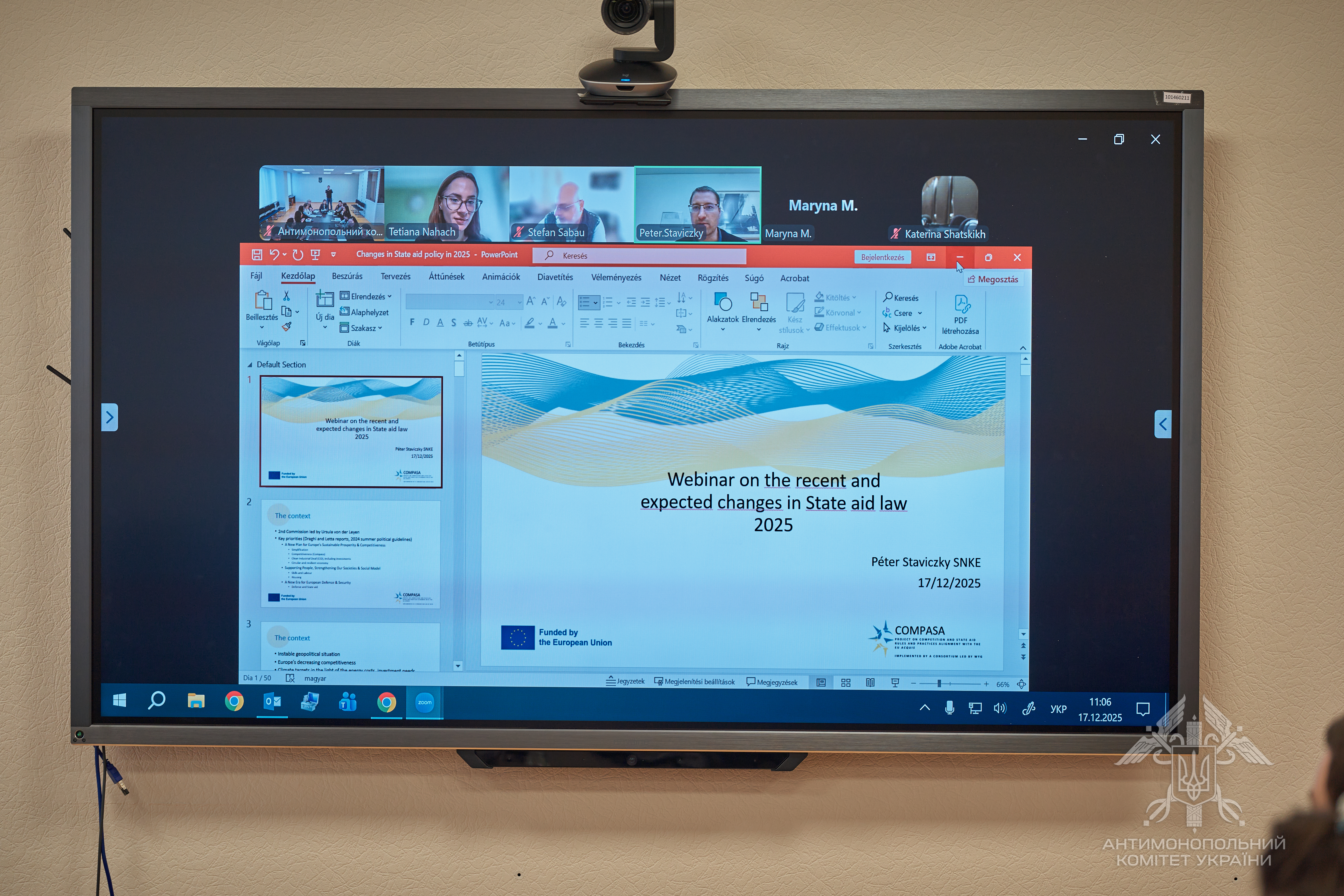 17 грудня 2025 року представники Антимонопольного комітету України долучилися до вебінару на тему «Нещодавні та найближчі зміни у законодавстві про державну допомогу у 2025 році». Під час заходу, організованого проєктом «Узгодження правил і практик конкуренції та державної допомоги із законодавством ЄС (COMPASA)», учасники розглянули актуальні тенденції та очікувані новації у праві Європейського Союзу у сфері державної допомоги.