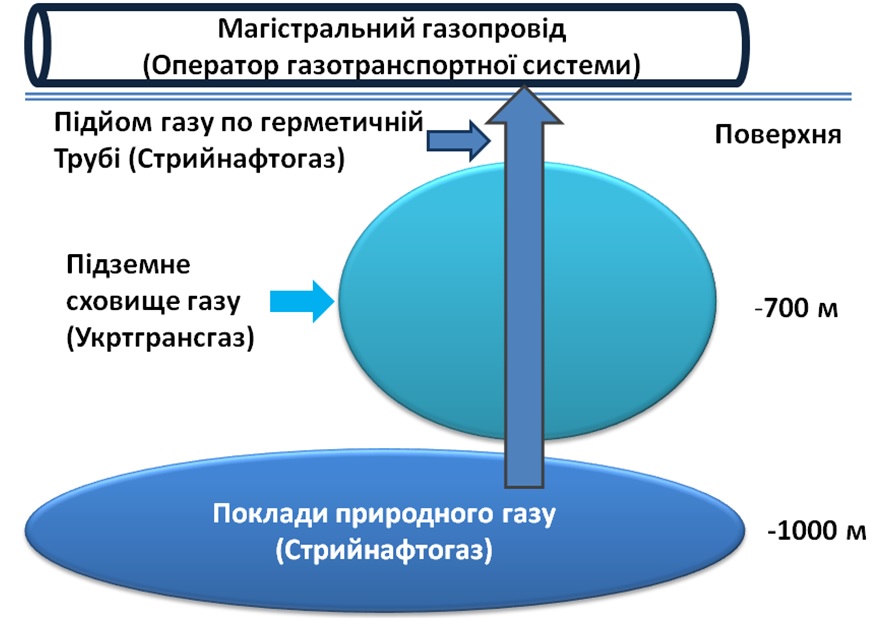 Товариство Стрийнафтогаз, отримавши всі необхідні дозволи, добуває газ на родовищі з назвою Добрівлянська площа та продає його споживачам. Між поверхнею і покладами газу, які добуває Стрийнафтогаз, є підземні сховища газу (в природніх прадавніх печерах), через які Стрийнафтогаз має пройти, щоб дістатися до тієї самої Добрівлянської площі. Просвердлити ґрунт, пройти сховище, потім знову пласти землі. Встановити герметичні труби і ними піднімати на поверхню добутий газ.