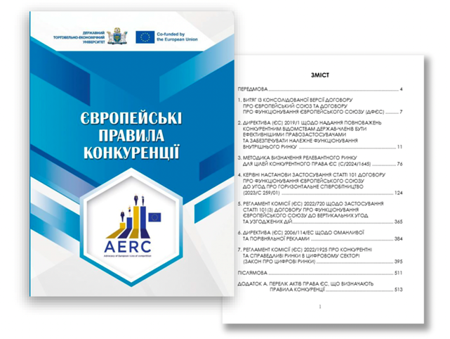 Проректор з науково-педагогічної роботи та міжнародних зв’язків Анжеліка Герасименко презентувала Антимонопольному комітету довідник «Європейські правила конкуренції», який є перекладом текстів ключових регламентів ЄС, що визначають правила конкуренції. Довідник призначений для працівників центральних органів виконавчої влади, зокрема Міністерства юстиції України, Міністерства економіки України, Антимонопольного комітету тощо, а також здобувачів вищої освіти, що цікавляться європейськими правилами конкуренції, та дослідників проблем гармонізації українських правил конкуренції з європейськими. Довідник підготовлено в рамках реалізації Проєкту Erasmus+ Jean Monnet 101047657 – AERC Advocacy of European Rules of Competition за підтримки Європейського Союзу.